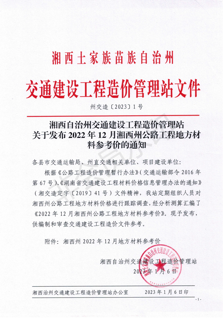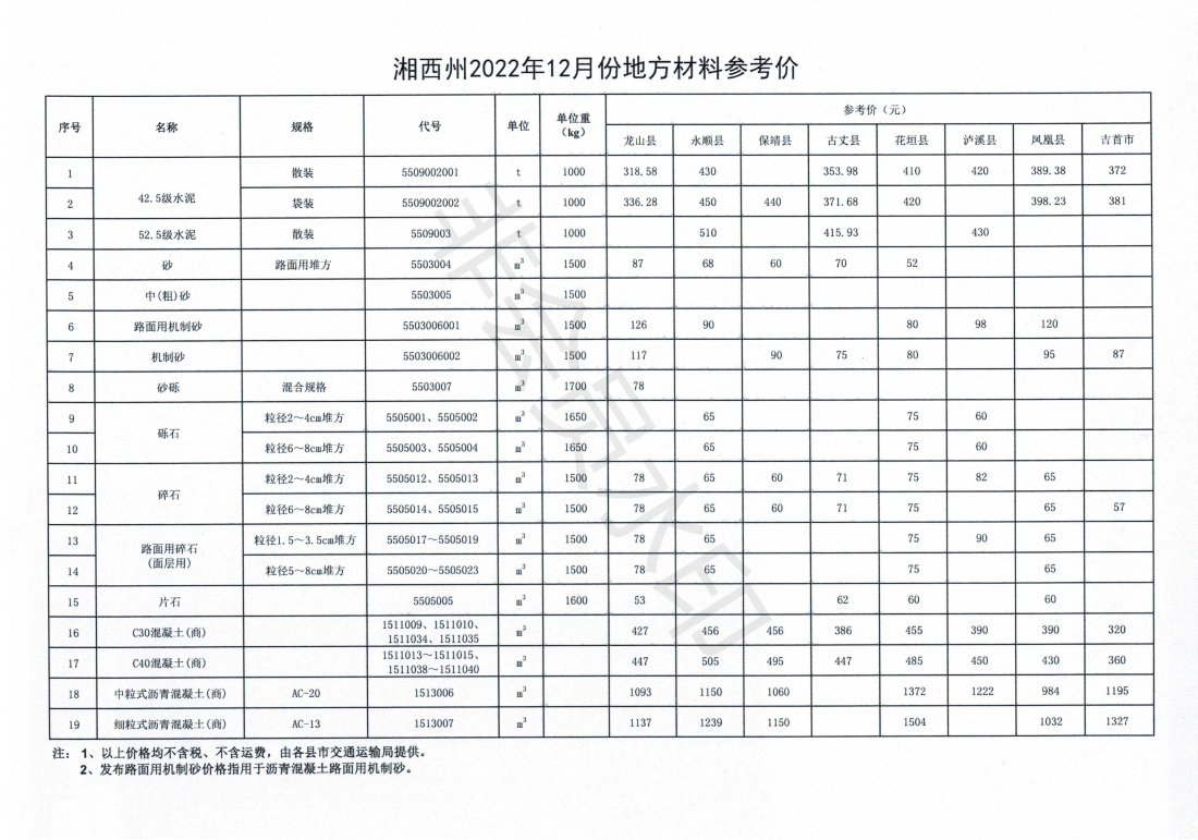 关于发布《2022年12月湘西州公路工程地方材料参考价》的通知