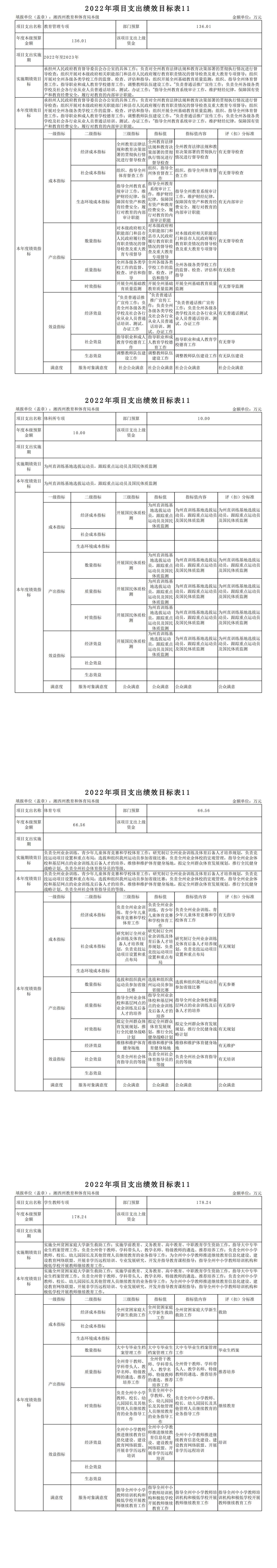 湘西州教体局2022年项目支出绩效目标表