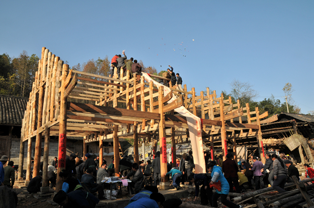 5.竖房。竖房当天,全寨人聚集相助,亲朋好友前来庆贺。