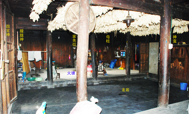 跨门进堂屋,正中埋有“龙宝”,后边为房间。堂屋的左右两边,有一间必铺地板,内设火堂。苗家对于火塘有着特殊的感情,各地民居不论哪种样式,都设有火塘,而且是不分昼夜、季节,火种长年不熄,以象征一家人气火热,兴旺发达。火塘上悬有炕架,用于熏烤腊肉、野味。火塘中间立有生铁铸的三角架,供劳作归来的苗家人围火煮饭炒菜。如有亲朋好友来访,大家围在火塘边饮酒放歌,其乐融融。火塘内放的三角铁架象征祖先,故不能踏脚,一家人围坐在它的周围,在祖先的庇护下,充分享受家的温暖。火塘的设置很讲究,通常用条石镶边之后,又用椿木在周围围成正方形,然后在火塘周围用硬木板铺成离地面约一尺高的地楼,苗家称之为“班众”,时常擦得明光闪亮。火塘的安置要与中柱屋脊相对称,偏前偏后俱不相宜。靠边一排中柱下方,是安家神的位置,苗家人称之为“行果”,相当于汉族的“神龛”。平常供祭时,在这里烧香纸,以酒敬之。所以在围火塘烤火时,主宾有别,坐规有序,即以中柱一边为上方,属长者座位,客人、妇女及小孩不能坐此方位,更不能在此打闹;下方坐晚辈,其他两方不论。