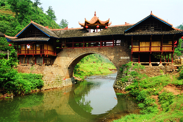 风雨桥,亦叫花桥。既作交通之用,又有宗教含义,象征飞龙绕寨,以保村寨风调雨顺,五谷丰登。有石礅横木风雨桥和石拱风雨桥两种形式。