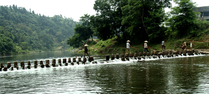 苗乡溪河纵横,人们生活劳作天天要过溪河。河面较窄时,苗家人就架石桥过河。但河床较宽,不易架桥时,苗家人就在溪流中竖起一根根粗大的石柱,这就是人们常说的“跳岩”。修跳岩为公益事业,自发组织,不吃谁家饭,不花谁家钱,只要上工时喊一声就行了,各自扛起工具参战。大家按照一定的线路,在水中岩石上凿成距离相等的石槽,再把条石竖直插于槽中固牢。这样修成的跳岩既美观又减少洪水冲力,行人可稳稳当当地来回行走,别具苗乡韵味。