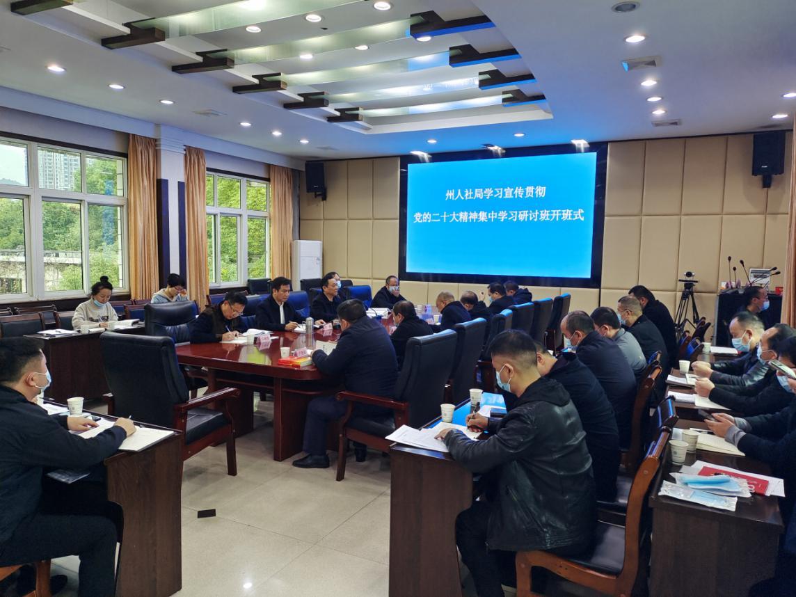 11月21日,州人社局召开党的二十大精神学习研讨动员会,局机关全体干部职工、局属单位主要负责人参加。