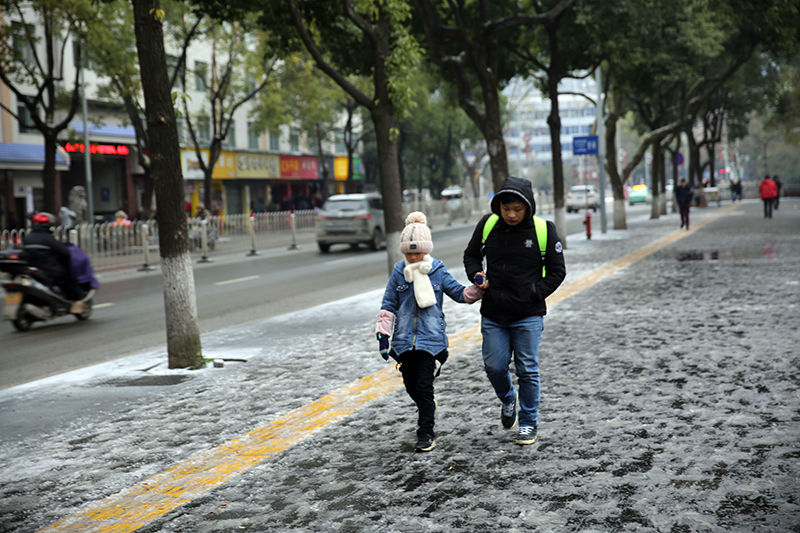 吉首市人民北路街道上,行人在满是积雪的路上走过。