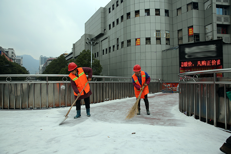 环卫工人仔细地清扫天桥上的积雪。