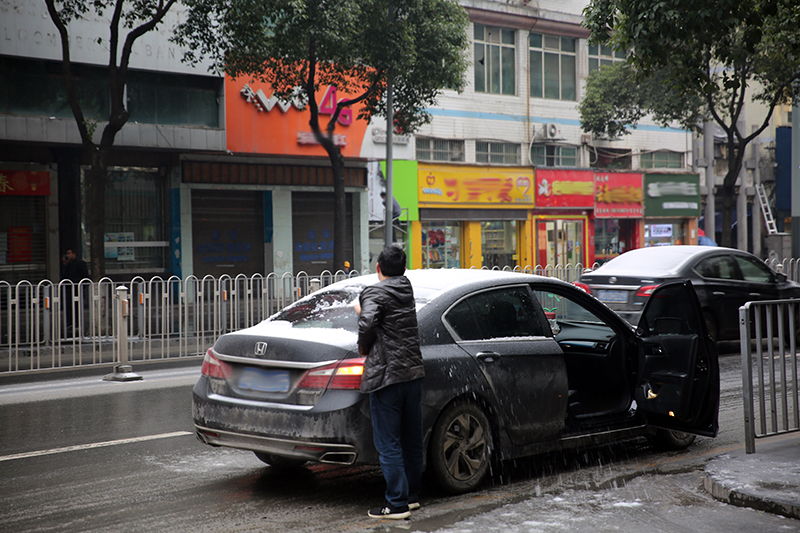 吉首市道路上,一名司机正在擦拭后玻璃窗上的积雪。