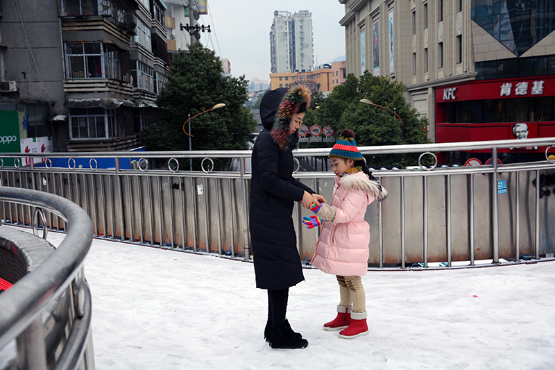 吉首市人行天桥上,一位妈妈帮助女儿整理冬衣。