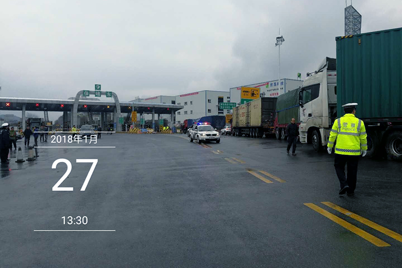 张花高速保靖东收费站出口实行交通管制现场。