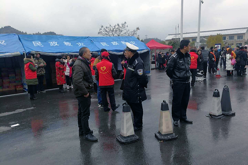 图为保靖县交警大队民警和民政部门工作人员搭建临时休息棚照顾好滞留旅客的生活问题。