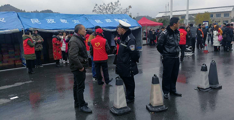 图为保靖县交警大队民警和民政部门工作人员搭建临时休息棚照顾好滞留旅客的生活问题。