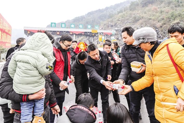 1月28日,湘西经开区党员干部和志愿者在为高速吉首南站滞留的旅客发送盒饭、矿泉水等物资,并积极帮助联系落实住宿宾馆。 本报特约记者 刘振军 通讯员 全 伟 摄