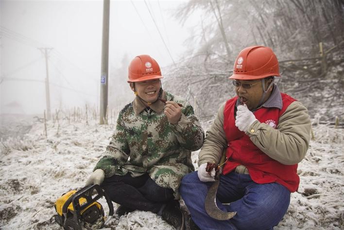 1月28日,龙山县里耶镇八面山,电力抢险人员在抢修覆冰线路途中吃干辣椒御寒。 田良东 摄