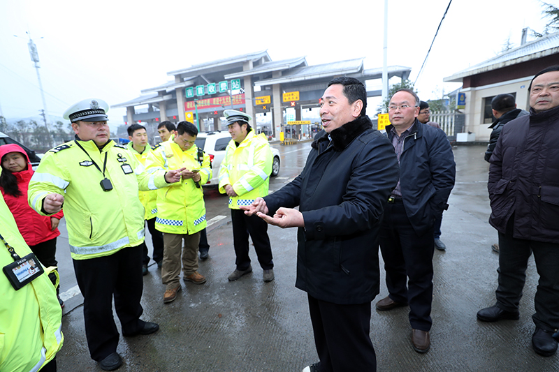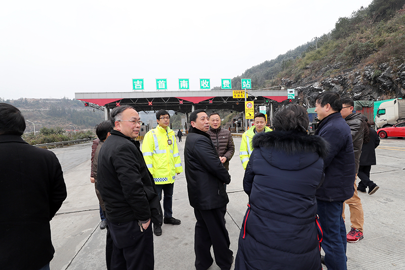 1月27日至28日,州委常委、常务副州长向恩明带领州直部门相关负责人到吉首市、凤凰县现场检查防冻抗灾工作。图为1月27日,向恩明(中)一行来到高速公路吉首(雅溪)收费站,现场察看交通安全运行情况。(州人民政府网 周兴云 摄)