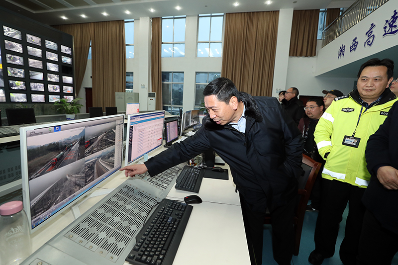 1月27日至28日,州委常委、常务副州长向恩明带领州直部门相关负责人到吉首市、凤凰县现场检查防冻抗灾工作。图为1月27日,向恩明(左一)一行来到湘西高速公路应急联合指挥中心,调度全州高速公路安全运行情况。(州人民政府网 周兴云 摄)