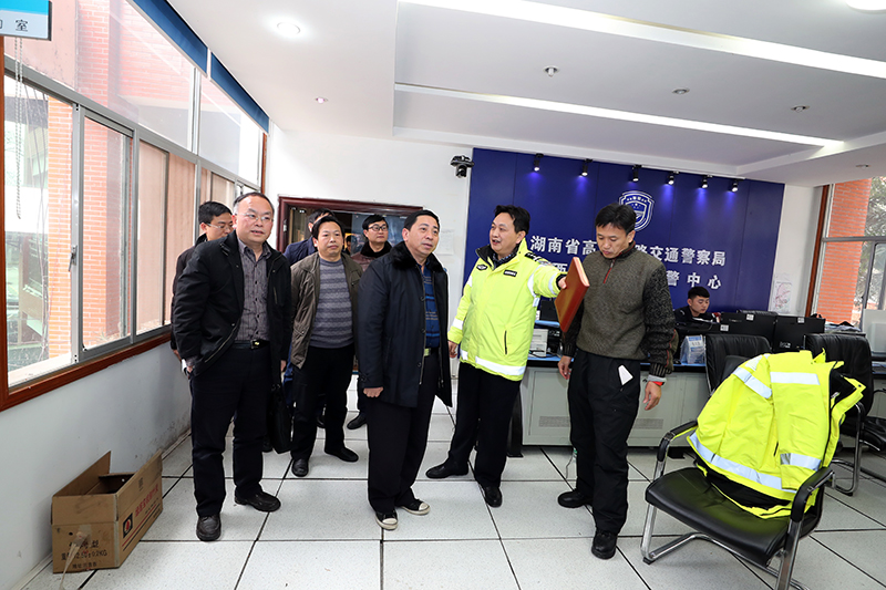 1月27日至28日,州委常委、常务副州长向恩明带领州直部门相关负责人到吉首市、凤凰县现场检查防冻抗灾工作。图为1月28日,向恩明(中)来到省高速公路交通警察局湘西支队调度全州高速公路安全运行情况。(州人民政府网 周兴云 摄)