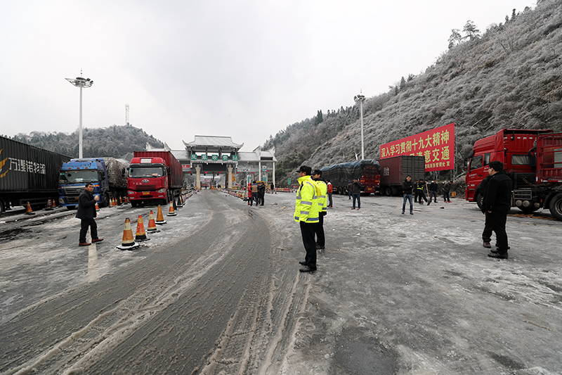 1月27日至28日,州委常委、常务副州长向恩明带领州直部门相关负责人到吉首市、凤凰县现场检查防冻抗灾工作。图为1月28日,公安交警指挥从高速公路凤凰收费站下高速的滞留车辆安全有序停放。(州人民政府网 周兴云 摄)