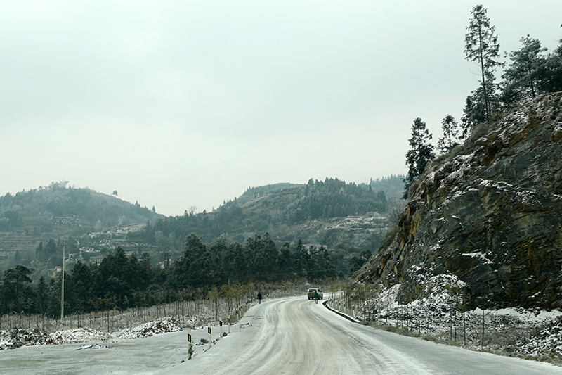 1月27日至28日,州委常委、常务副州长向恩明带领州直部门相关负责人到吉首市、凤凰县现场检查防冻抗灾工作。图为1月28日,吉首市至凤凰县国道被冰雪覆盖。(州人民政府网 周兴云 摄)