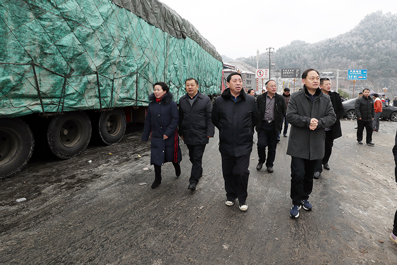 1月27日至28日,州委常委、常务副州长向恩明带领州直部门相关负责人到吉首市、凤凰县现场检查防冻抗灾工作。图为1月28日,向恩明(中)来到高速公路吉首南收费站现场察看滞留车辆交通疏导情况。(州人民政府网 周兴云 摄)