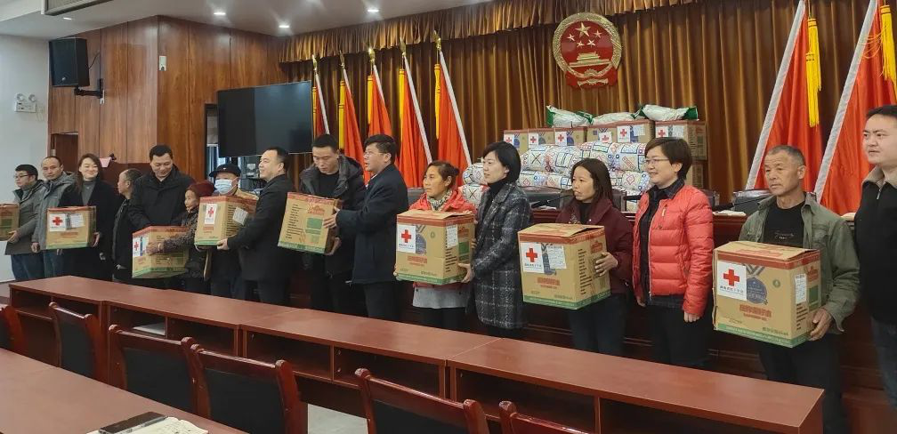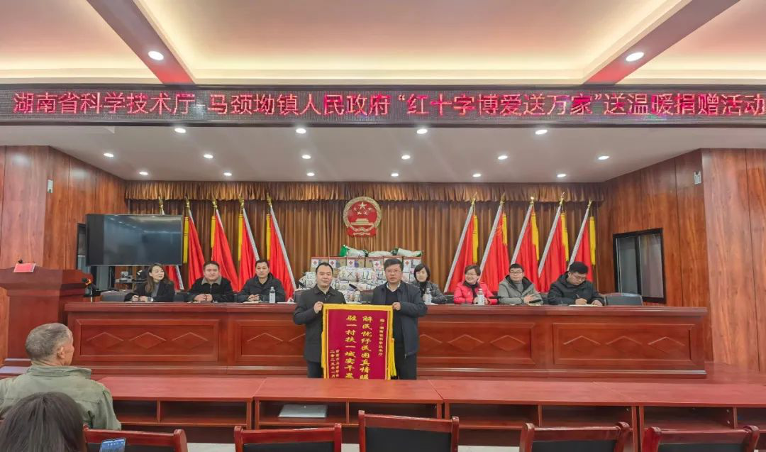 宣传会后,现场举行“湖南省科学技术厅-马颈坳镇人民政府‘红十字博爱送万家’送温暖捐赠活动”,为马颈坳镇监测户送上米、油、被面等物资。
