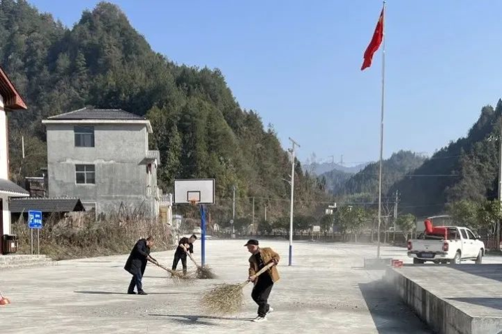 ▲1月30日,州信访局乡村振兴工作队与龙山县水田坝镇枫坪村村支两委共同打扫坪坝环境卫生,共创美丽乡村。