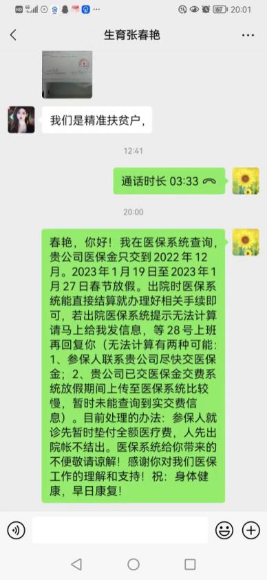 爆竹声中一岁除,春风送暖入屠苏,1月22日是我国农历传统佳节“春节”,在一片欢乐祥和的氛围中,参保群众张女士收到了一条来自吉首市医保局工作人员的信息:“春艳,你好,我在医保系统查询,贵公司医保金只交到2022年12月…出院时医保系统能直接结算就办理好相关手续即可,若出院医保系统提示无法计算请马上给我发信息…”,这一条长长的信息,言语真诚,内容详尽,及时告知了张女士在春节期间该如何报销生育险,遇到特殊情况该如何处理,及时解决了张女士的燃眉之急。